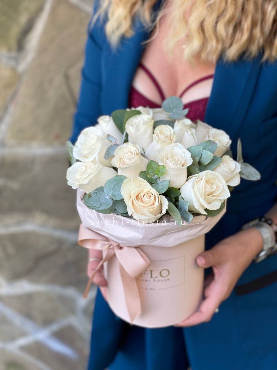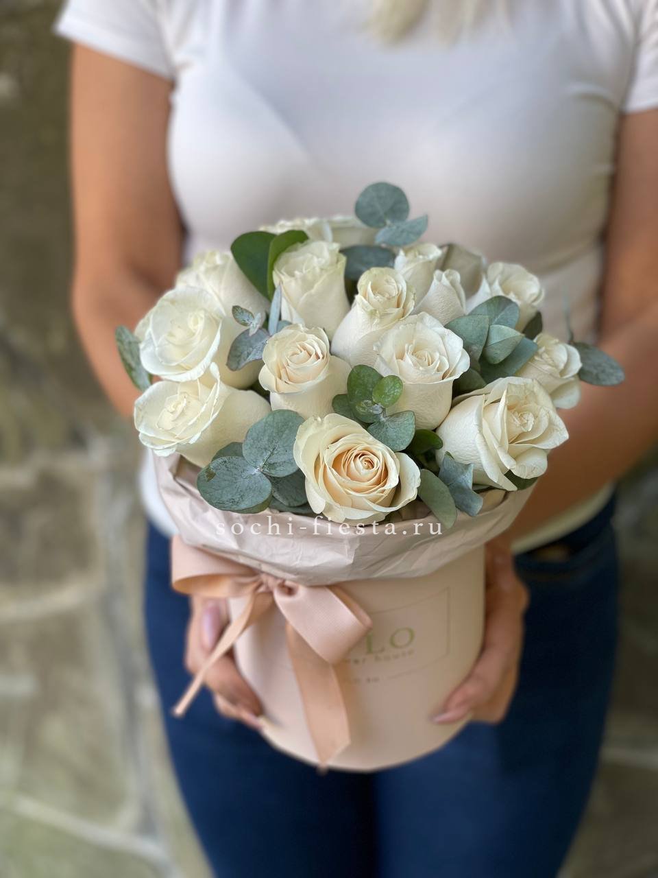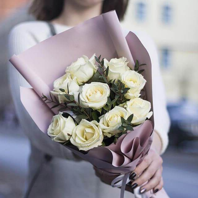 белые розы с эвкалиптом в сумочке.