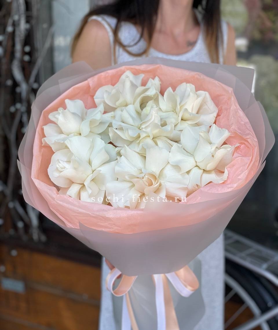 Пятьдесят один бутон выстраиваются в объёмную сферу с чёткой геометрией. Белые розы держат форму и создают ощутимое визуальное присутствие. Букет занимает пространство уверенно и спокойно.