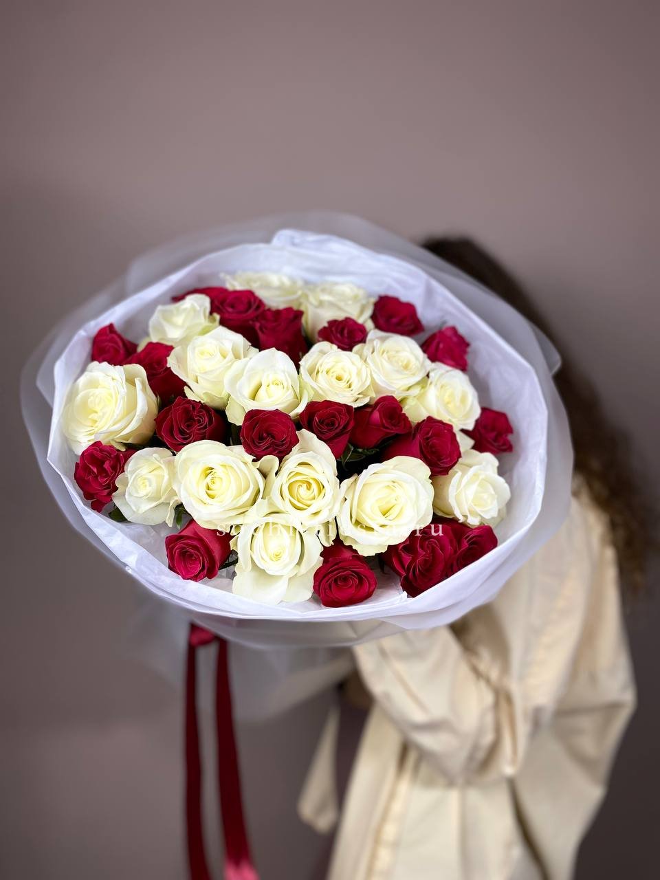 Белые розы собраны в плотную округлую форму с ровным силуэтом. Дизайнерская упаковка подчёркивает графичность линий и создаёт завершённую композицию. Букет с выразительным присутствием.