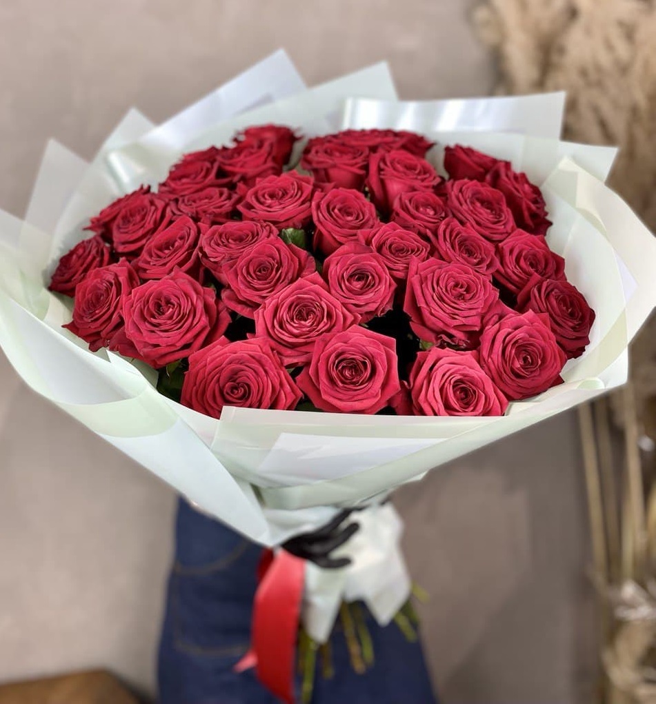 Классическая красная гамма в масштабной подаче. Тридцать семь стеблей формируют округлую композицию с четким силуэтом. Букет занимает пространство и сразу привлекает внимание.