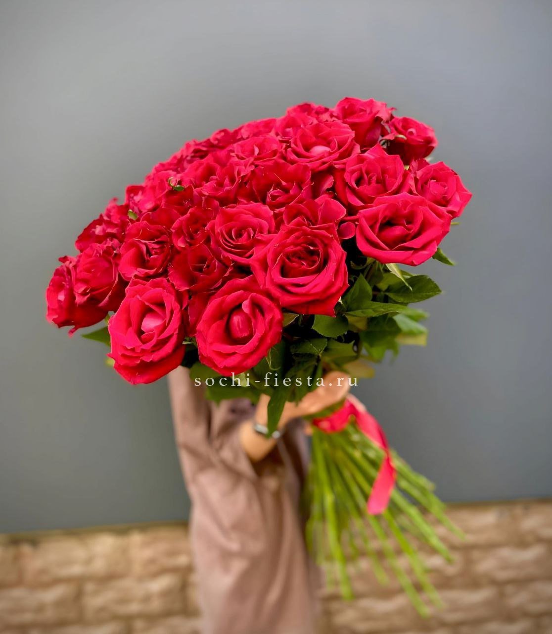 29 красных роз 70 см., лента, крафт или дизайнерская пленка.