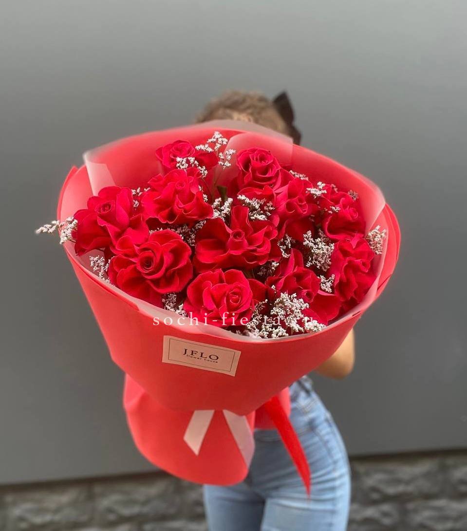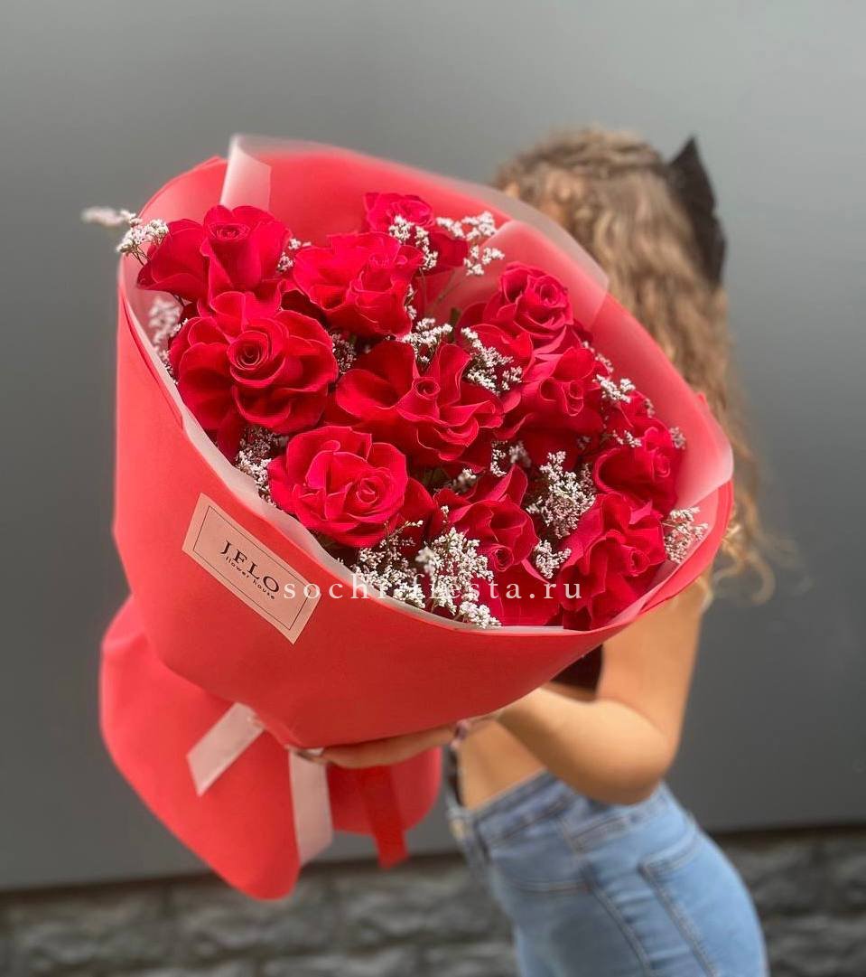 Сто одна голландская роза образует монументальную композицию. Красные бутоны выстраиваются в плотный объем, который невозможно не заметить и сложно забыть.