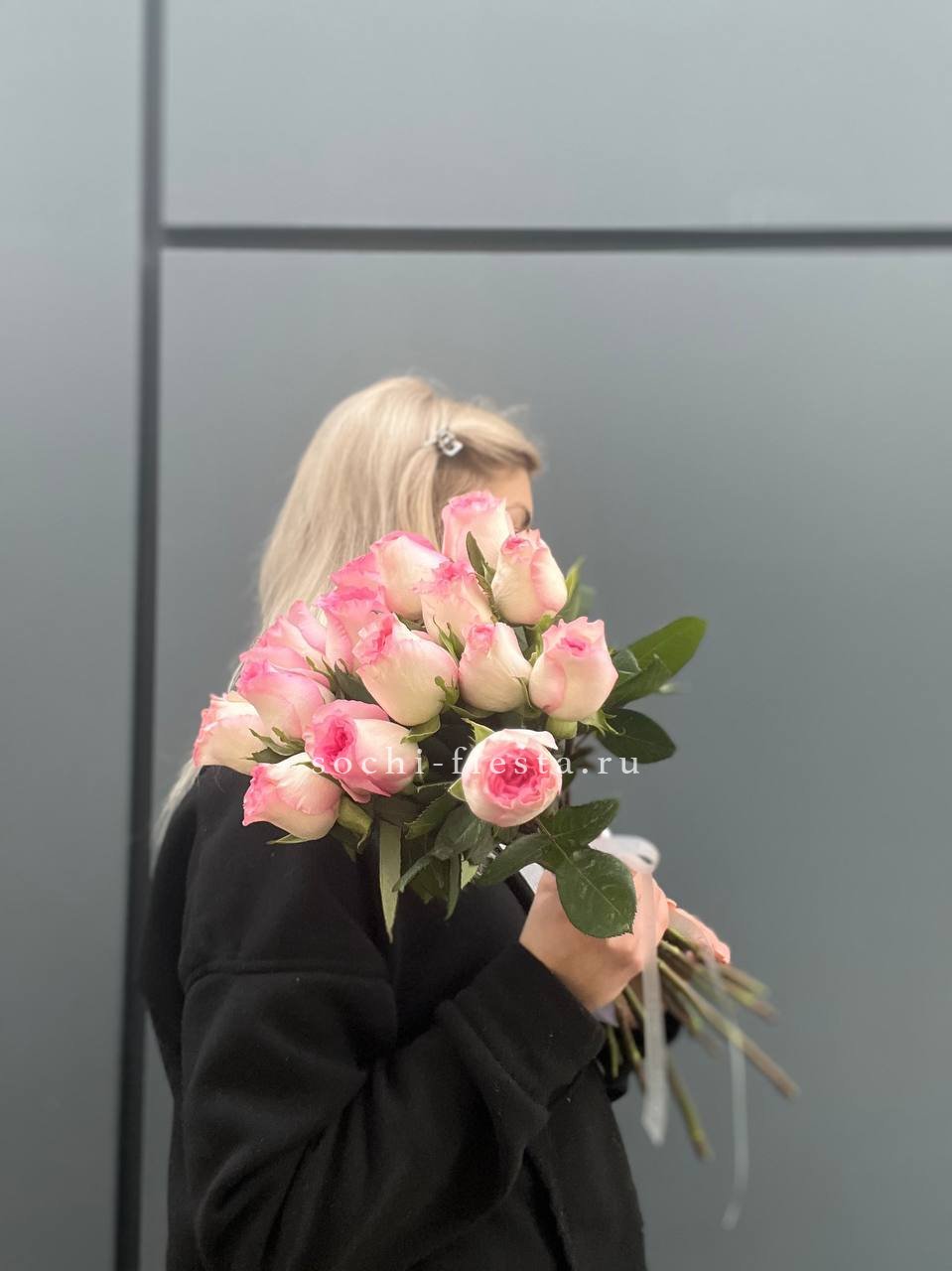 Сорт Mondala привлекает густыми лепестками с белой каймой и насыщенной розовой серединой. Пятнадцать бутонов собраны плотно и раскрываются постепенно. Кенийская пионовидная форма добавляет букету глубину и выразительность.