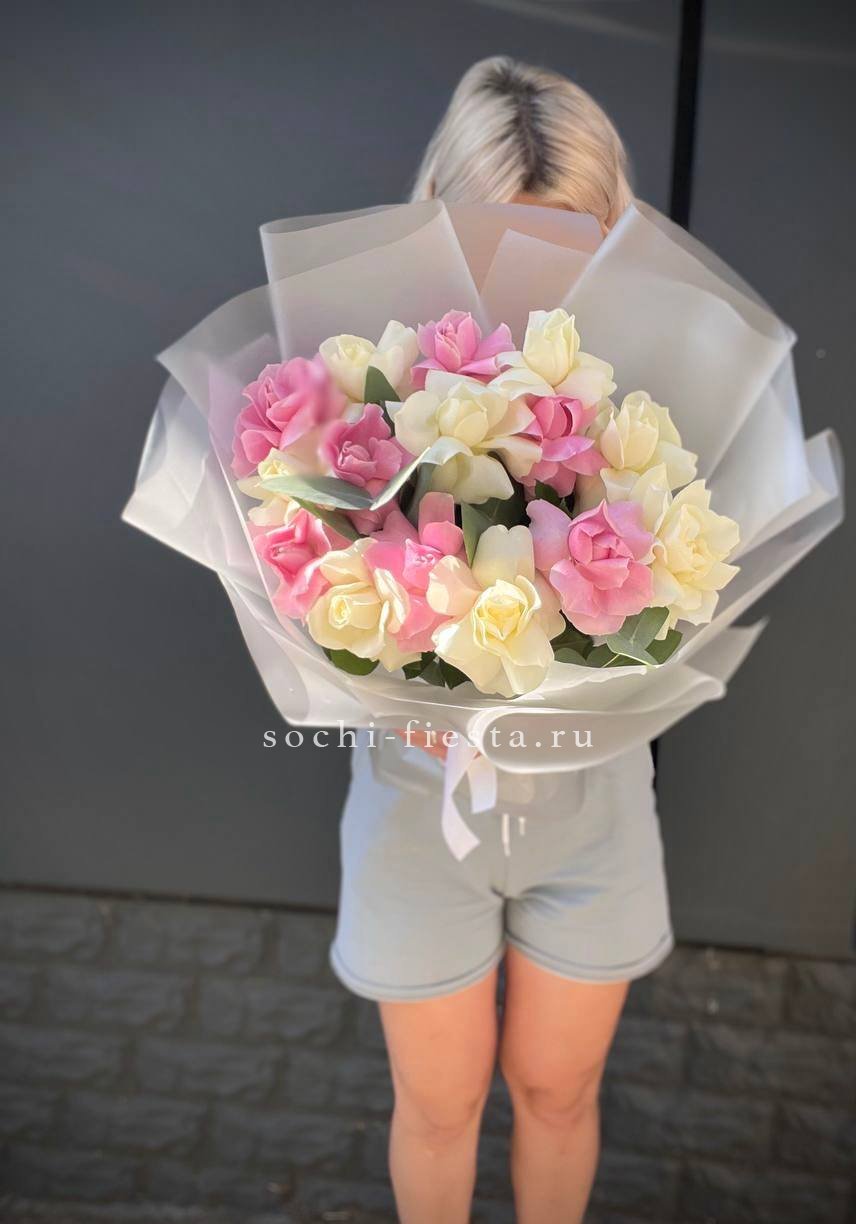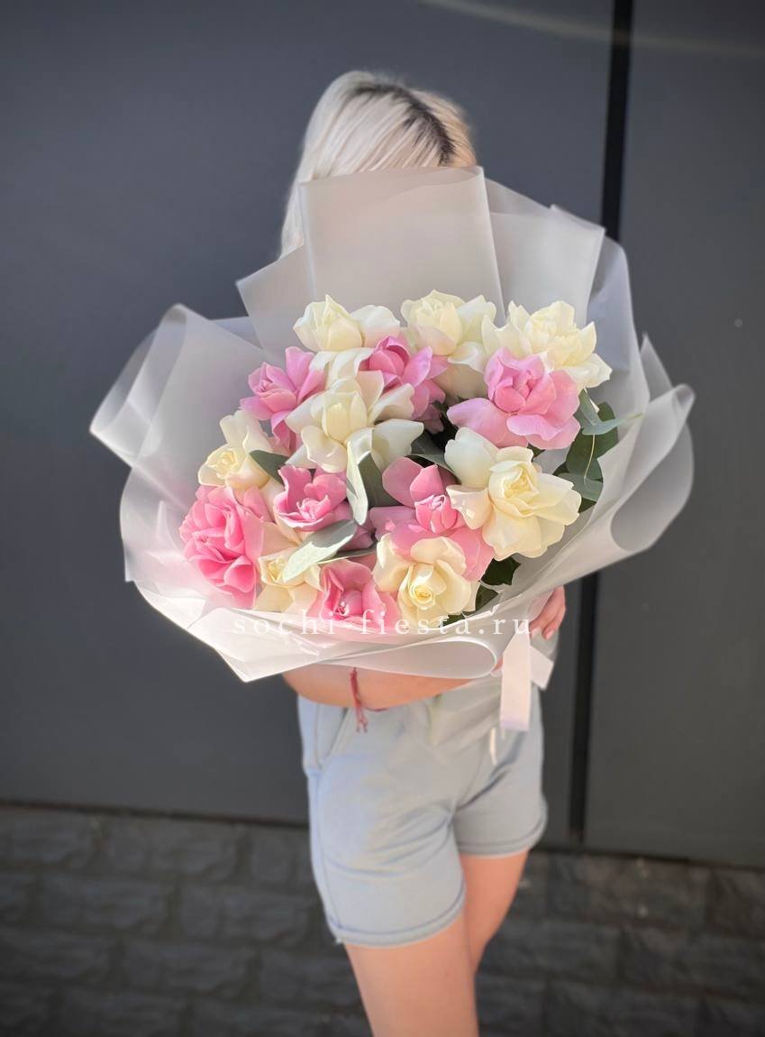Двадцать одна роза в оригинальной упаковке с игривыми ушками создает настроение легкости и свежести. Розовые бутоны собраны в аккуратную композицию, которая удерживает форму и выглядит выразительно в любом интерьере.