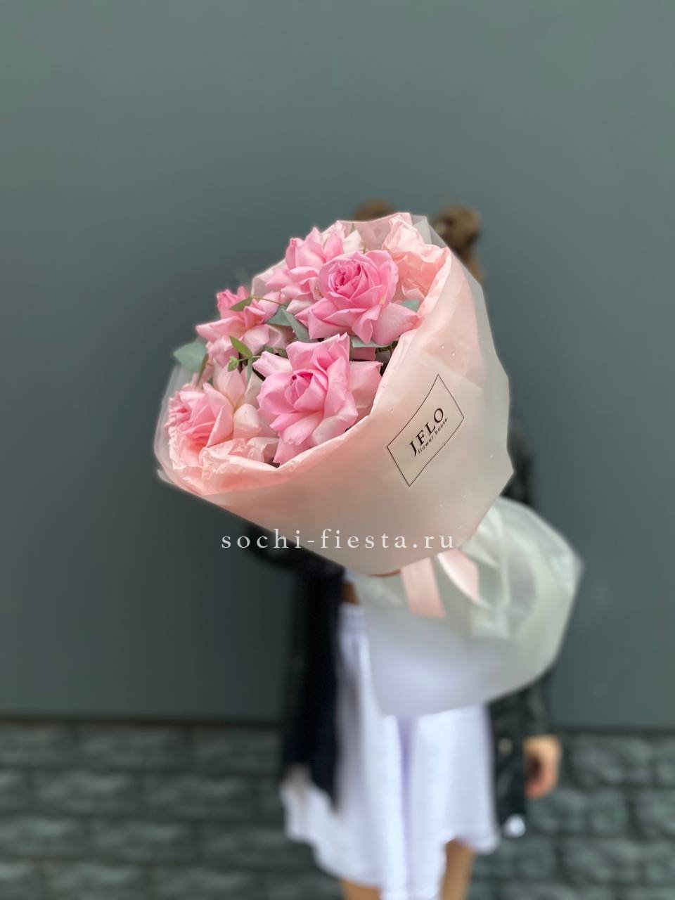 Пять вывернутых роз открывают всю внутреннюю структуру лепестков и демонстрируют розовый цвет во всей его глубине. Эвкалипт обрамляет бутоны и придает букету завершенность.