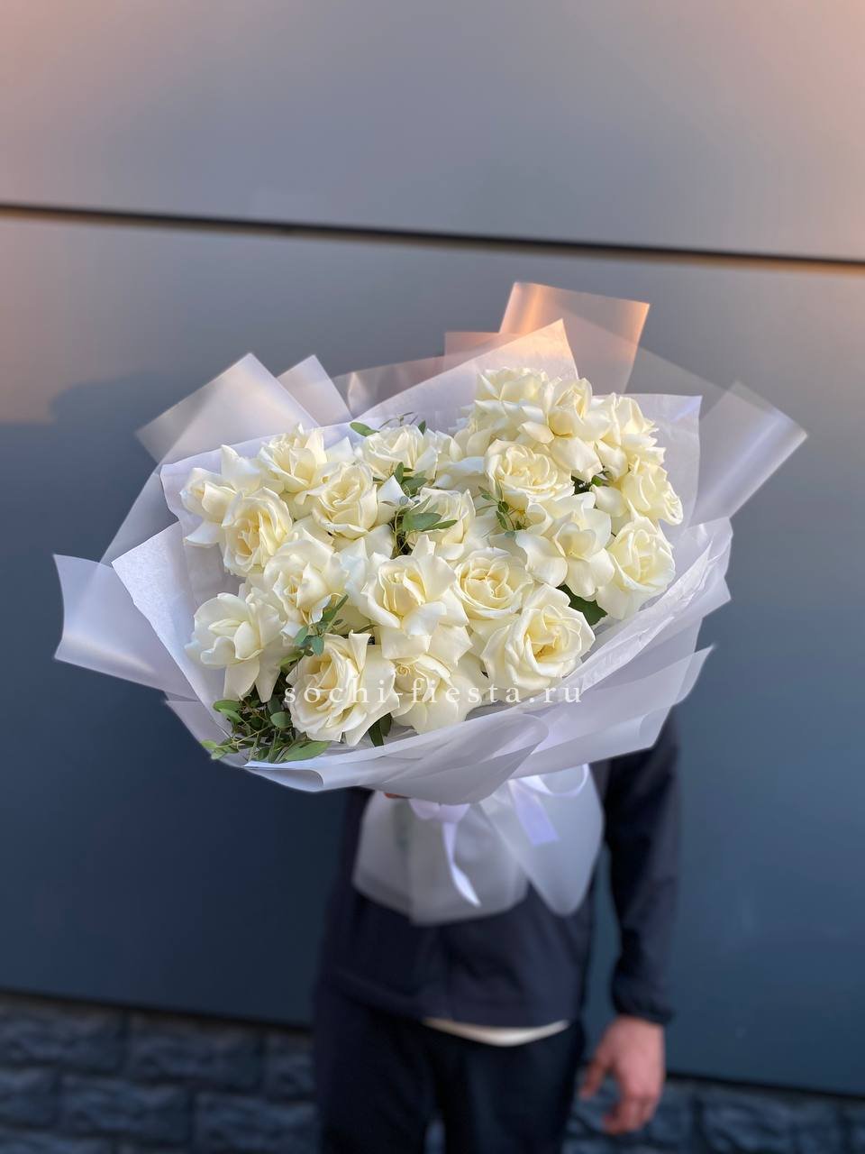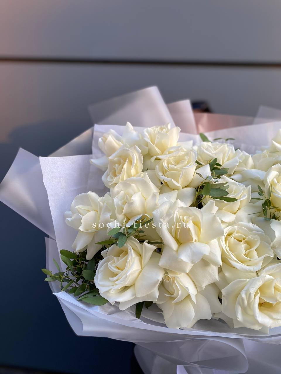 Семь вывернутых бутонов раскрываются широко и свободно, открывая слои белоснежных лепестков. Эвкалипт добавляет воздух и свежесть композиции.