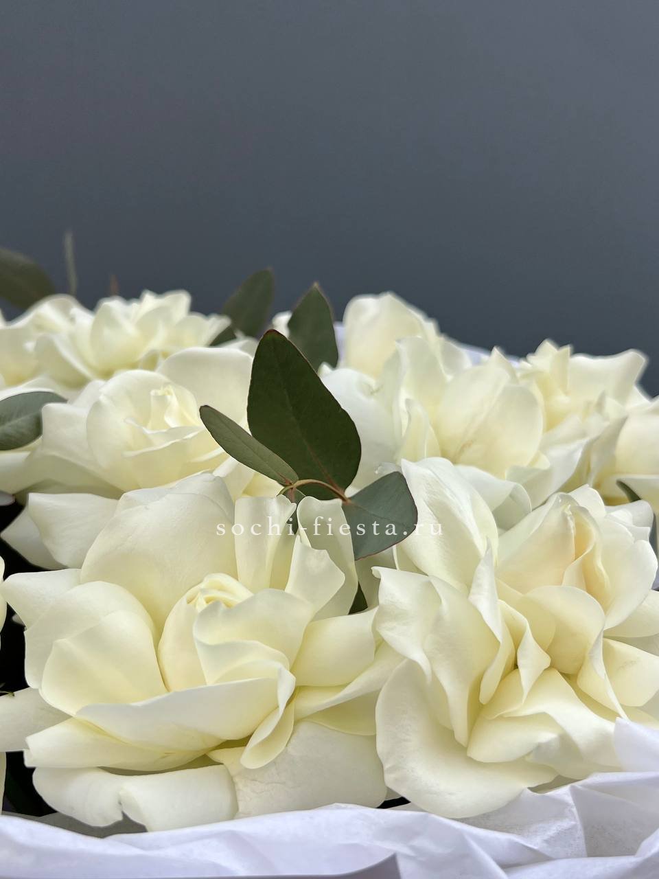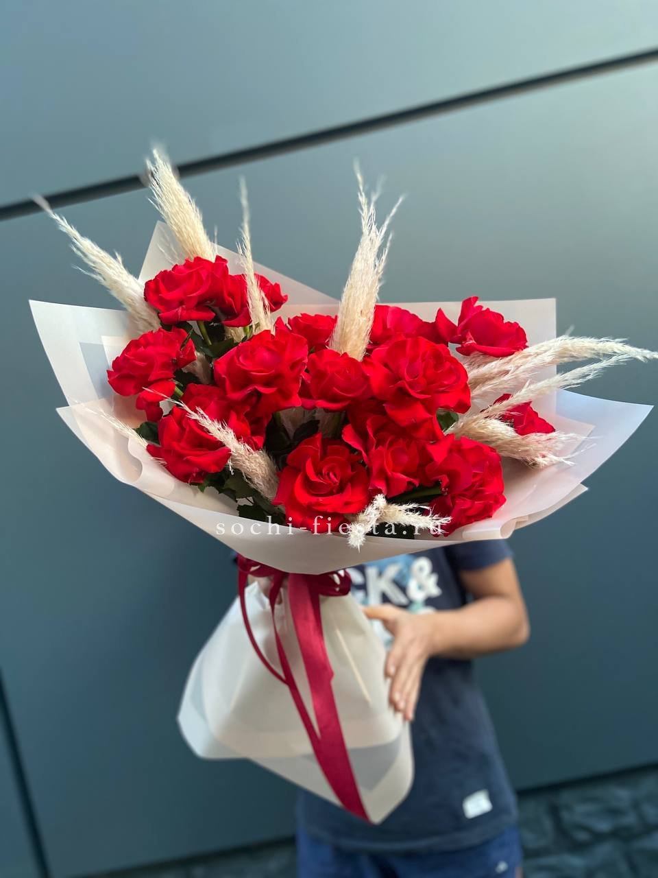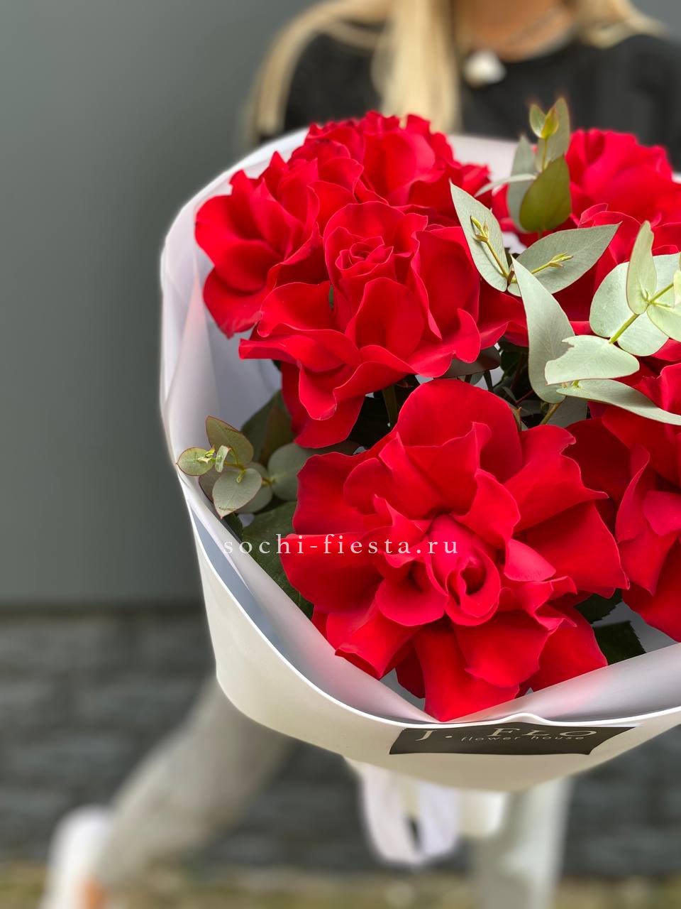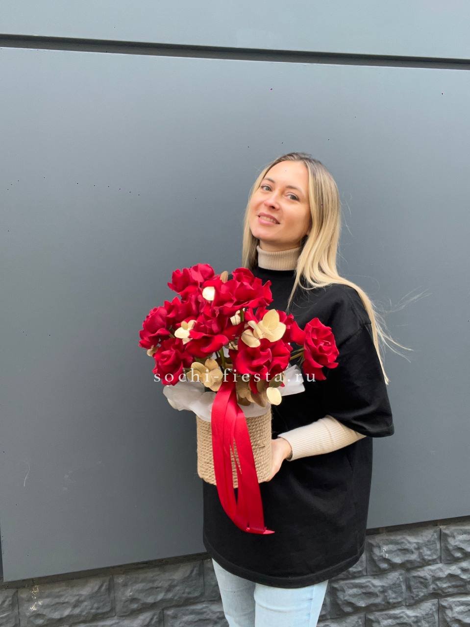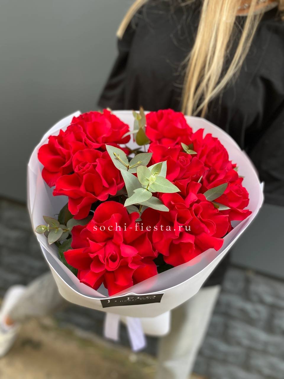 Глубокий красный тон распускающихся бутонов притягивает взгляд и удерживает внимание. Серебристая зелень эвкалипта создает прохладный фон для насыщенной палитры.
