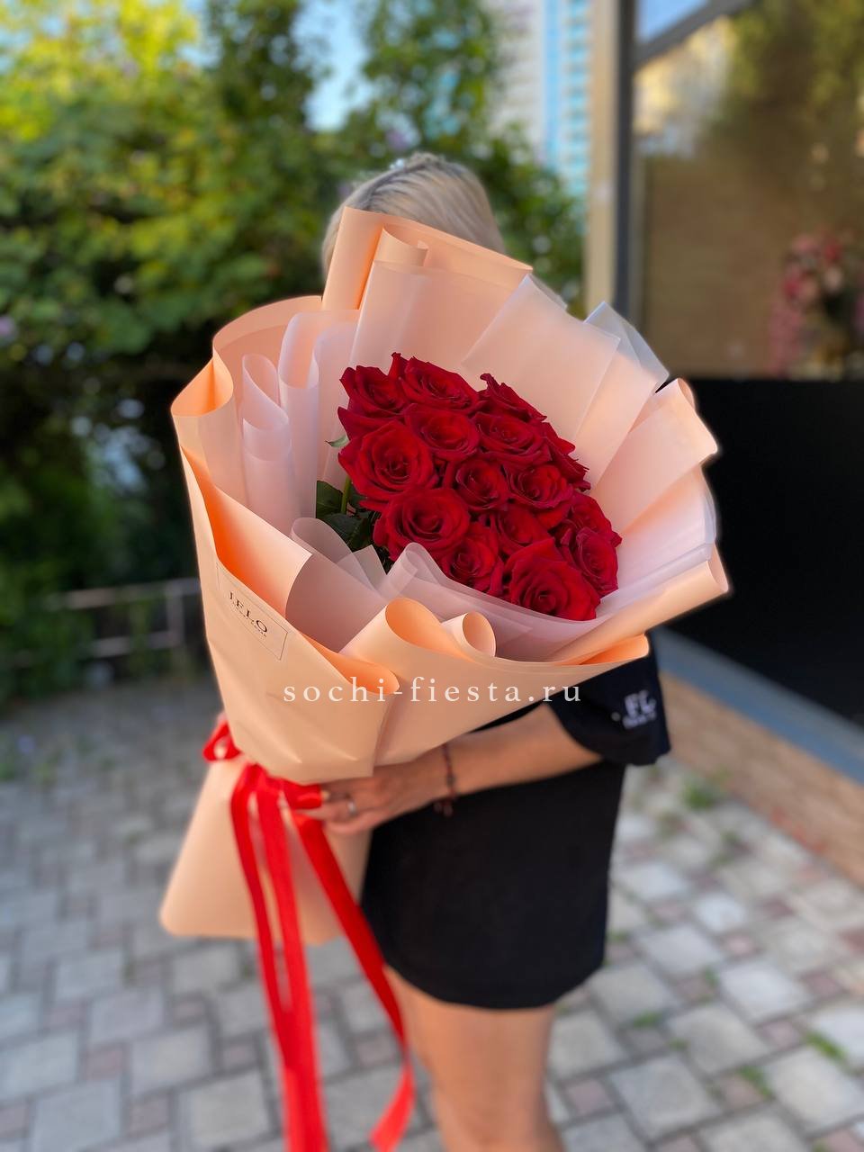 15 красных голландских роз 70 см, пленка, лента.