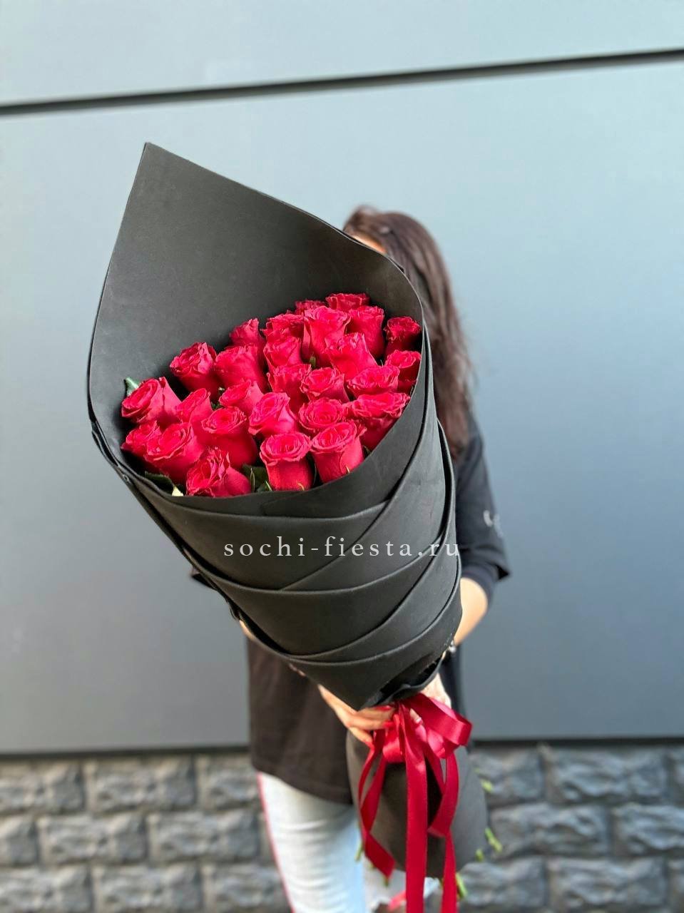 Двадцать пять стеблей выстроены в объёмную композицию с выразительным присутствием. Авторское оформление добавляет завершённость и подчёркивает масштаб букета.