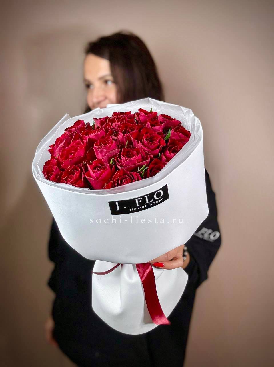 Сто одна красная роза хорошо сохраняет форму и долго радует свежестью бутонов. Плотная сборка обеспечивает аккуратный вид и удобство размещения в любом интерьере.