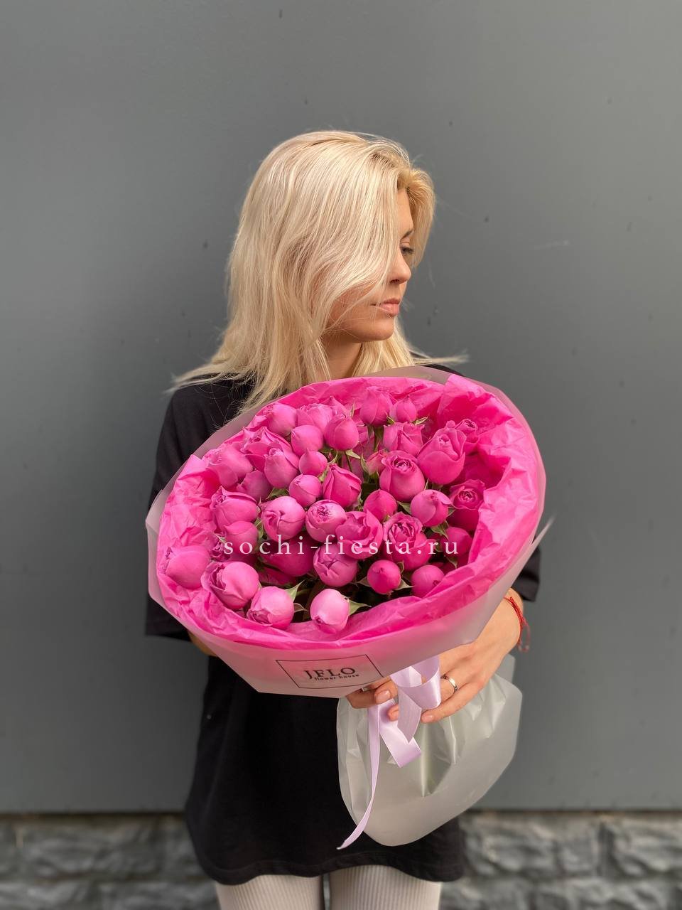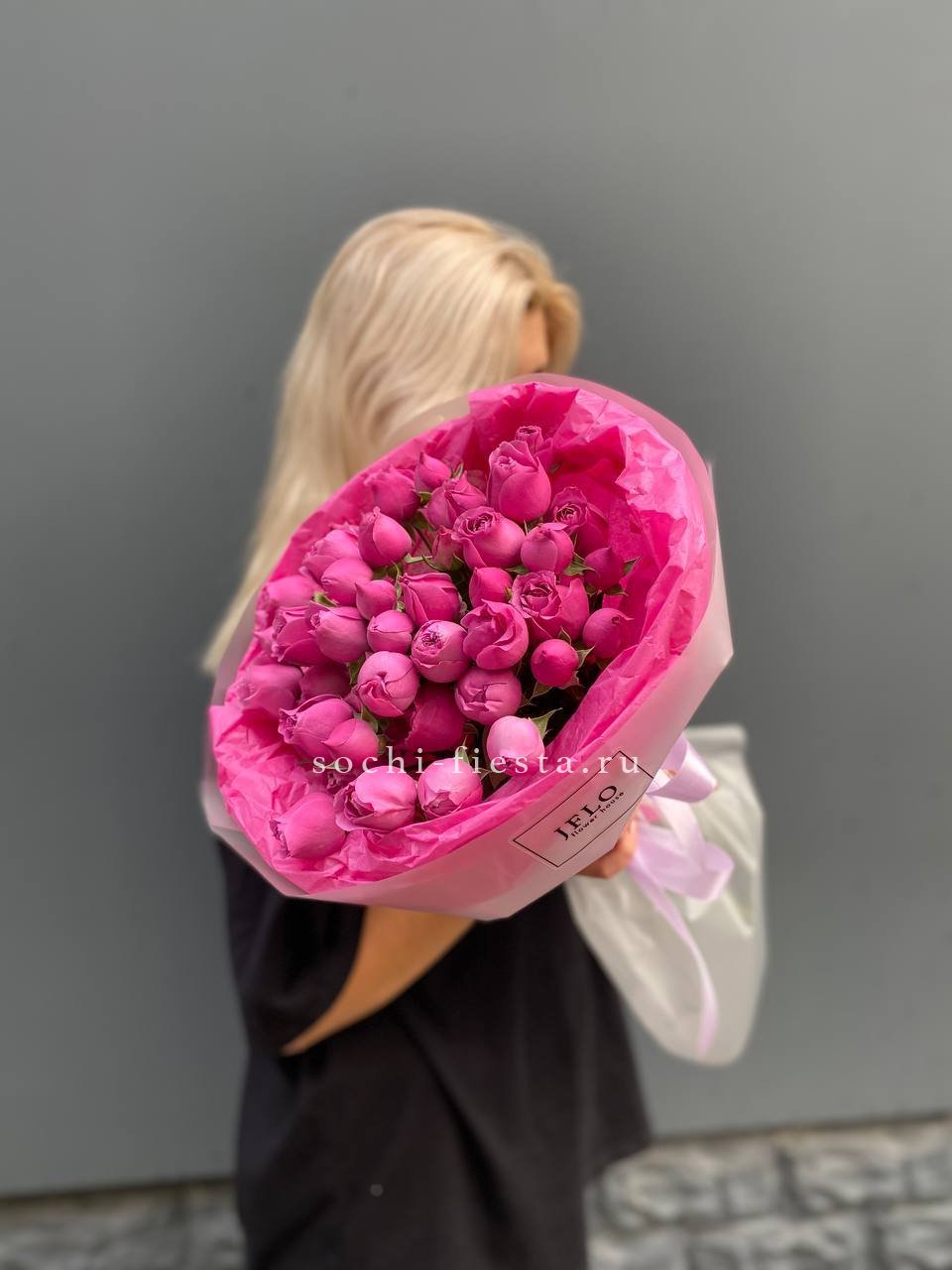15 пионовидных кустовых роз в сиреневых или розовых оттенках, лента, крафт или другая упаковка на усмотрение заказчика.