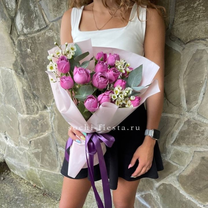 Основа сборных букетов в Рыбинске: розы (Freedom, Mondial, Avalanche), хризантема кустовая, альстромерия, эустома, фрезия, вероника. Дополнительно — ранункулюсы в сезон, хризантема одиночная, ирис весной, тюльпаны в апреле. Состав зависит от текущей поставки и сезона. Флорист всегда предлагает то, что в лучшей форме прямо сейчас.