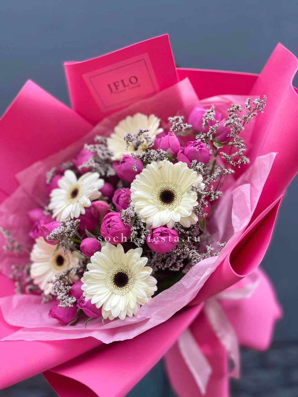 маттиола, розы, гортензия, диантусы, хризантемы , лента и дизайнерская пленка.