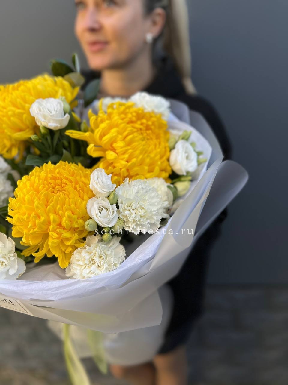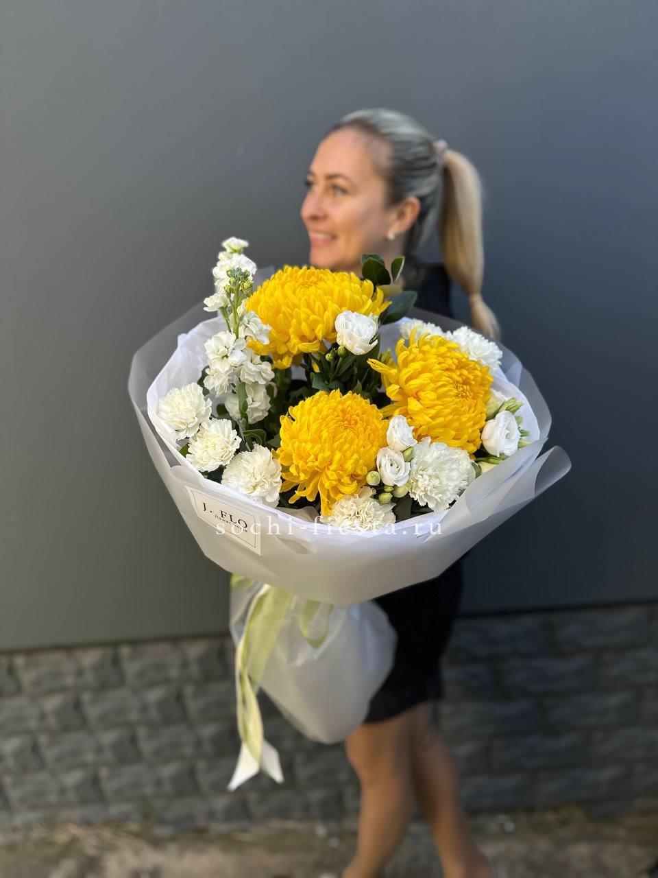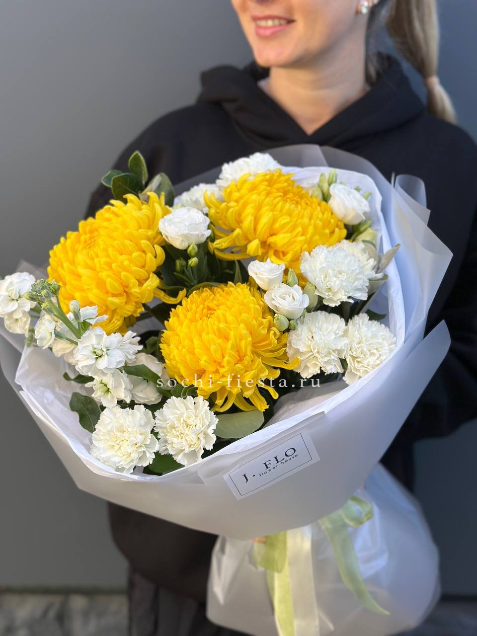 Маттиола и хризантема выстраивают плавную линию букета, где каждый бутон находит свое место. Autumn раскрывается теплыми оттенками и мягкой фактурой лепестков.