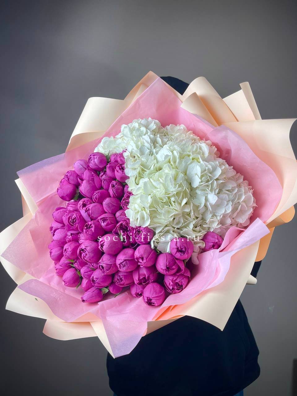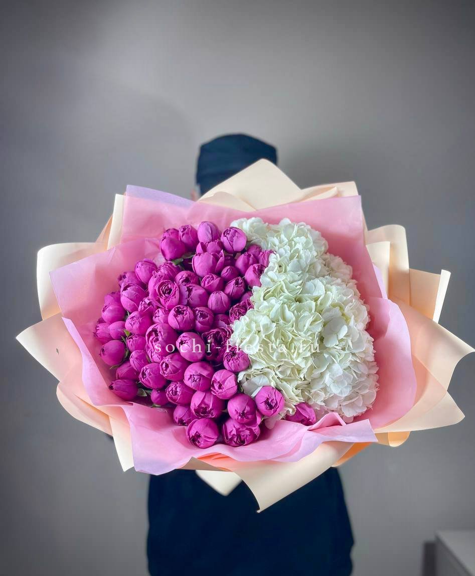 гортензия белая голландская, пионовидная роза Мисти Бабблс, оформление.
