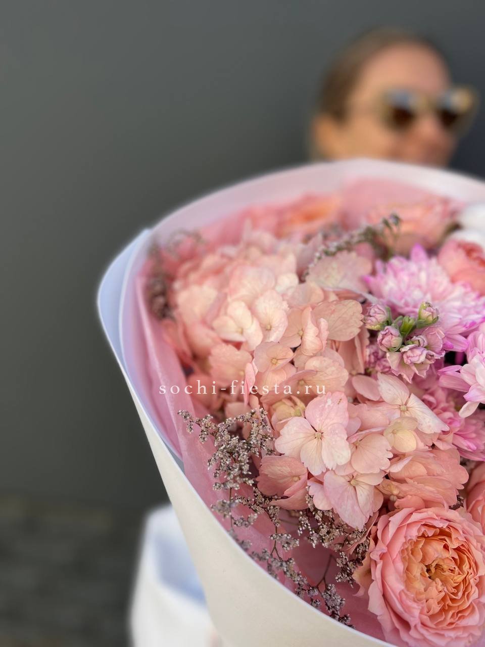 Пионовидные розы Джульетта с пышными шапками гортензии создают плотную композицию в пудровой гамме. Хлопок и лимониум добавляют воздушности, а кустовая хризантема заполняет пространство между крупными бутонами. Букет держит форму и долго сохраняет свежесть.