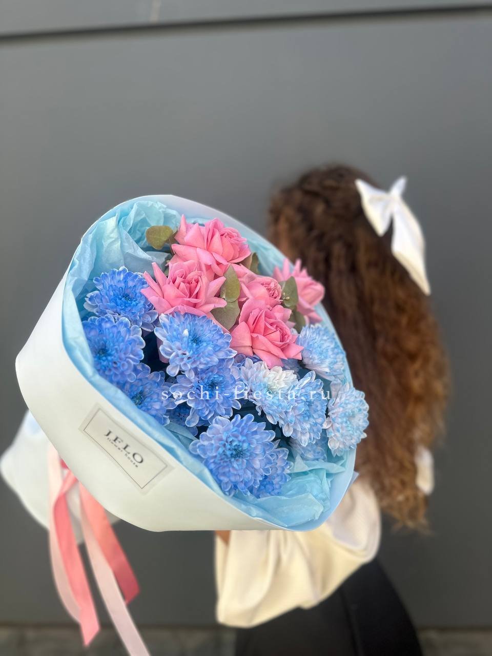 Воздушные соцветия кустовой хризантемы чередуются с яркими головками диантусов. Эвкалипт обрамляет букет серебристой зеленью, создавая лёгкое и свободное настроение.
