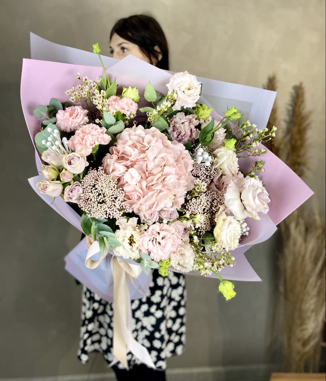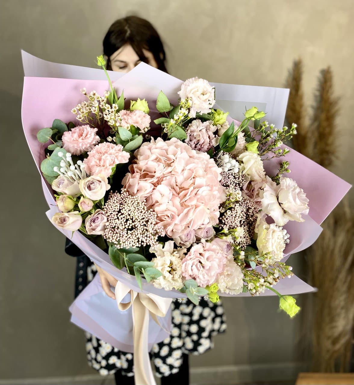 протея, декоративная зелень в зависимости от сезона, дизайнерская упаковка.