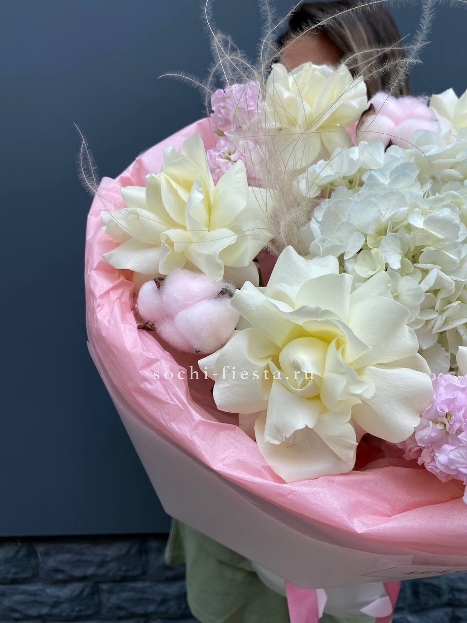 Розовые розы и диантусы окружены пышными соцветиями маттиолы и бомбастика. Композиция собрана плотно, каждый цветок поддерживает соседний, создавая объемную округлую форму. Букет держит силуэт и выглядит цельно с любого ракурса.