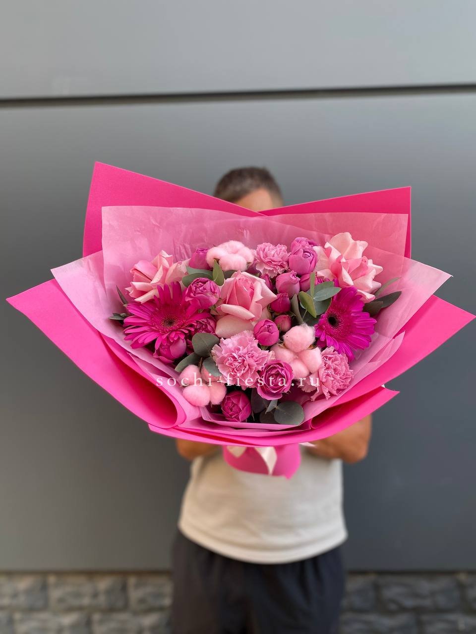 мисти баблс, розы, гербера, диантус, хлопок, упаковка.