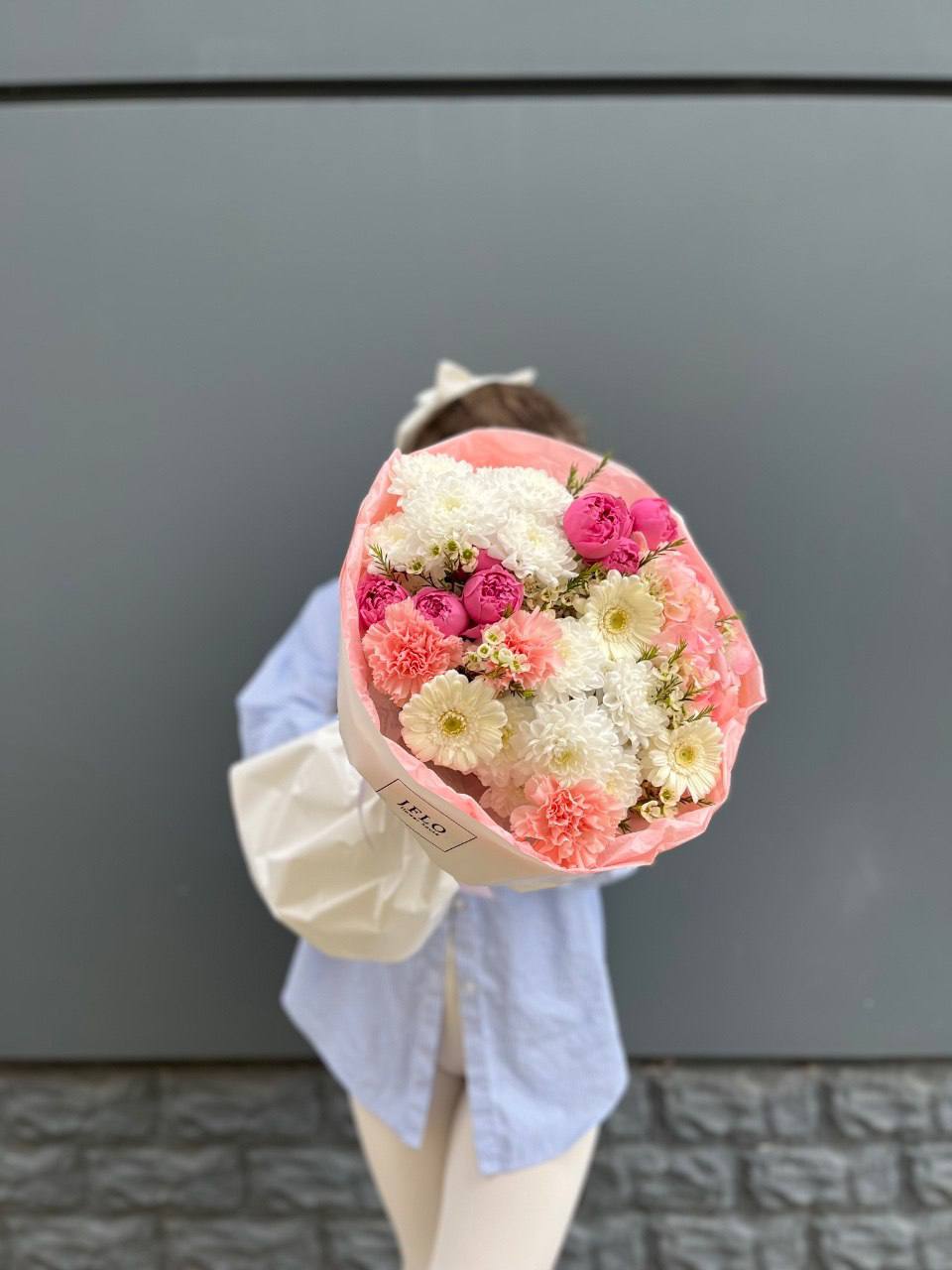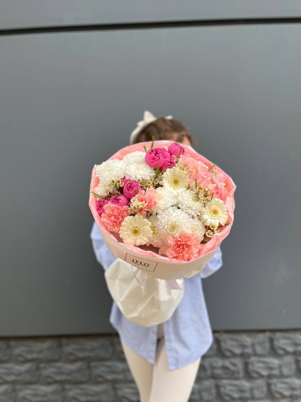 Белые розы и эустома образуют светлую основу, которую дополняют пионы и гортензия. Крафтовая упаковка удерживает форму, позволяя цветам раскрыться естественно и свободно.