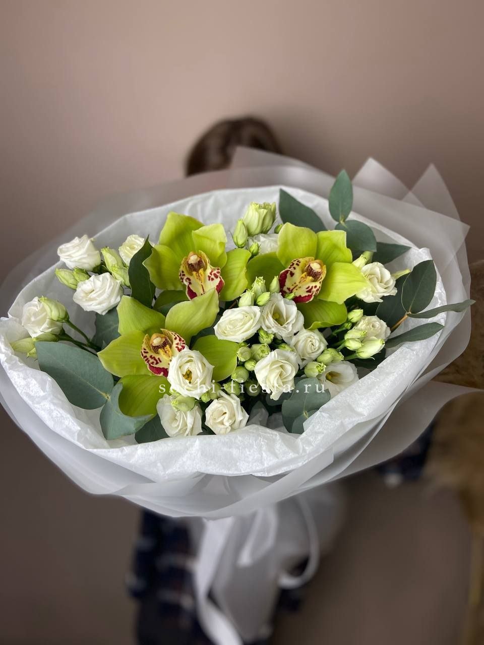 Орхидея цимбидиум выстраивает вертикальную линию рядом с воздушной эустомой. Букет легко размещается в узкой вазе и долго сохраняет свежесть.