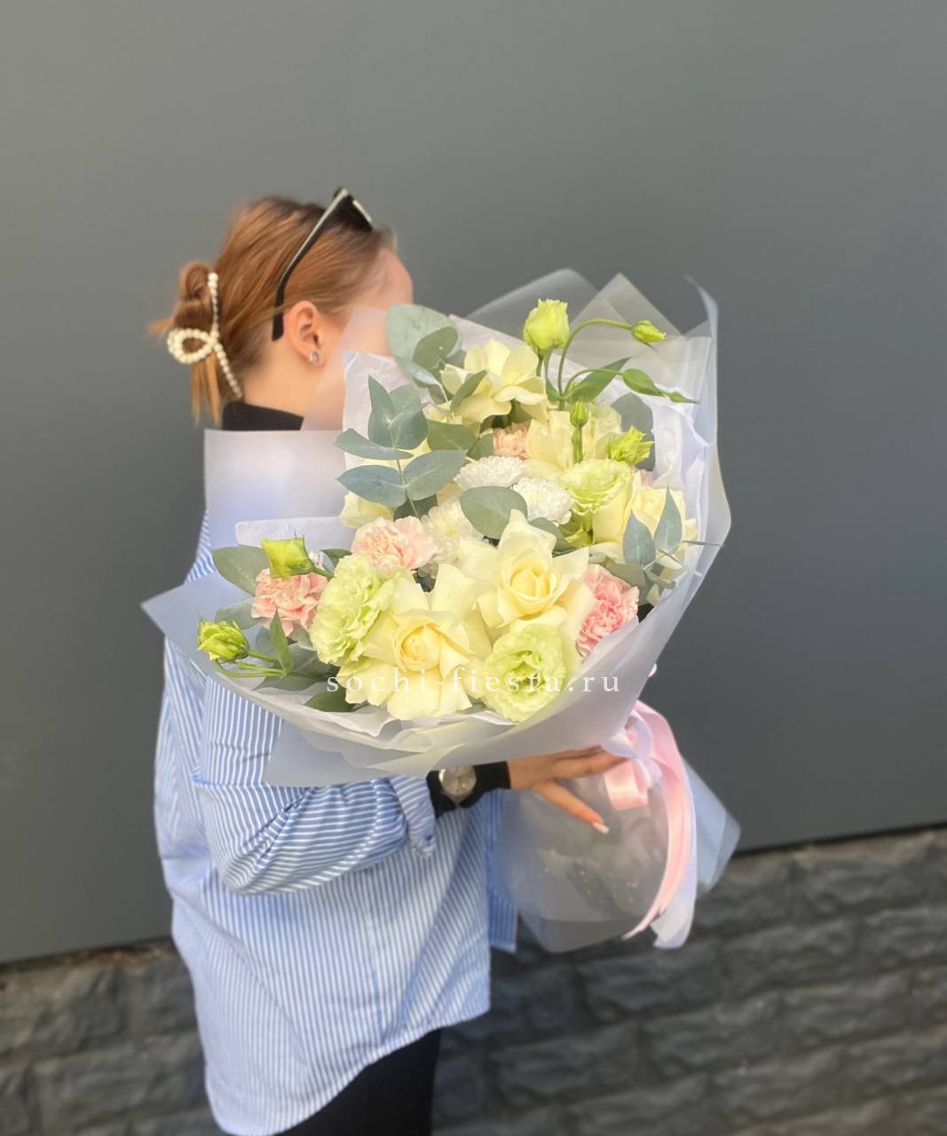 диантус, эустома, хризантема, белая роза, эвкалипт, упаковка.