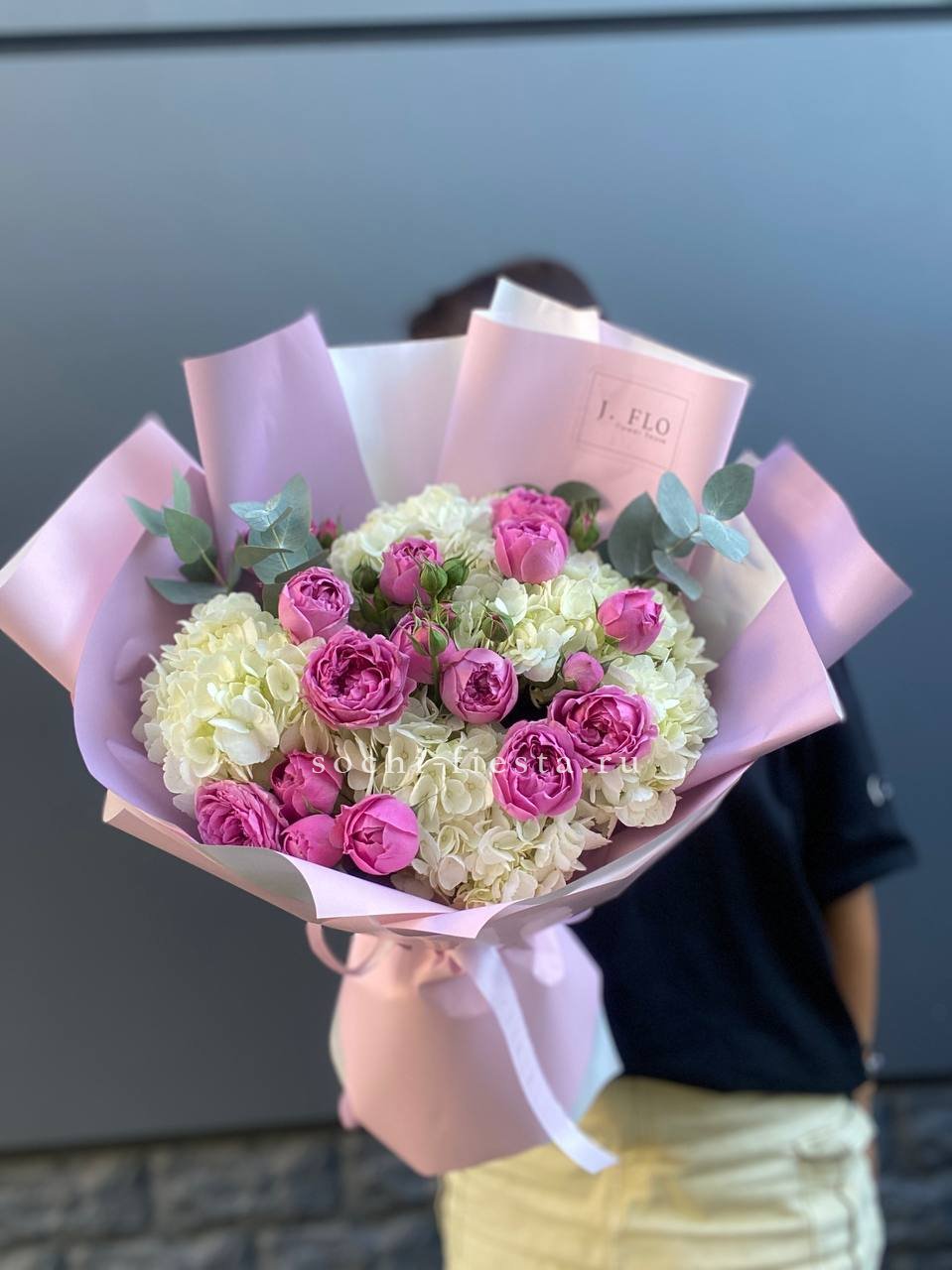 хризантема, гортензия, розовая роза, эустома, пионы ( может меняться, в зависимости от сезона), бомбастик, диантус, лента.
