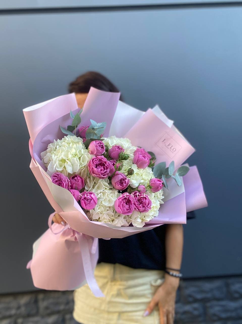 Масштабная композиция с пионами, эустомой и розами разворачивается во всей красе. Хризантемы и гортензия создают впечатляющее присутствие, которое преображает пространство вокруг.