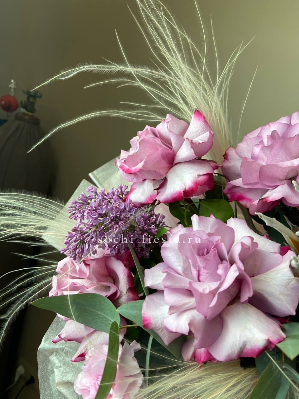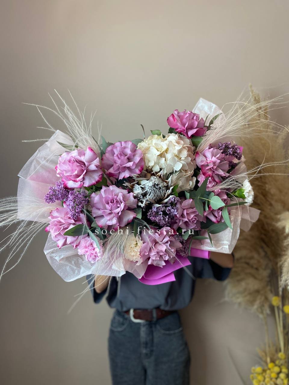 гортензия, сирень, французские розы, диантусы, протея, лента, дизайнерская упаковка.