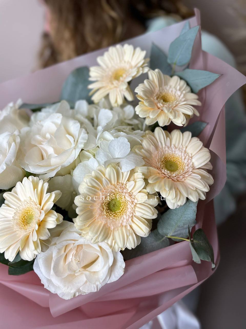 гортензия, роза одноголовая, бомбастик, декоративная зелень, эвкалипт, лента, дизайнерская упаковка.