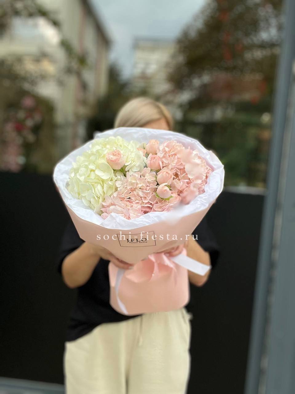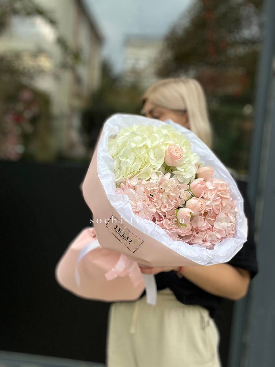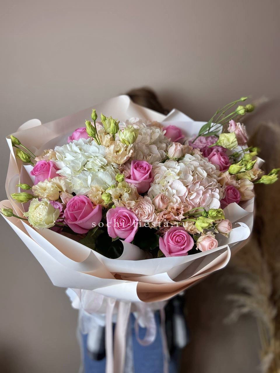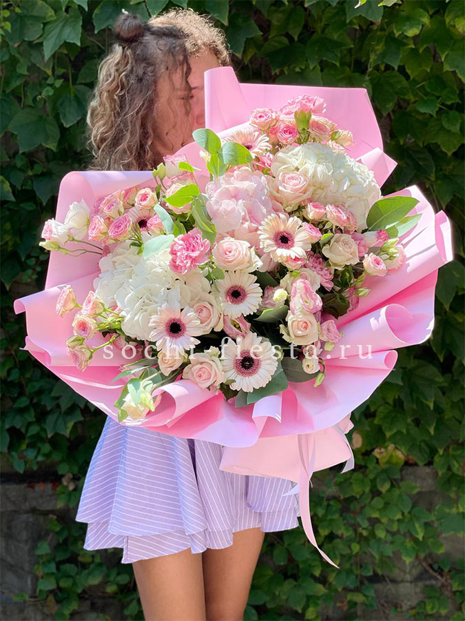 гортензия, диантус, кустовая пионовидная роза, эустома, вспомогательные цветы, эвкалипт, лента, дизайнерская упаковка.